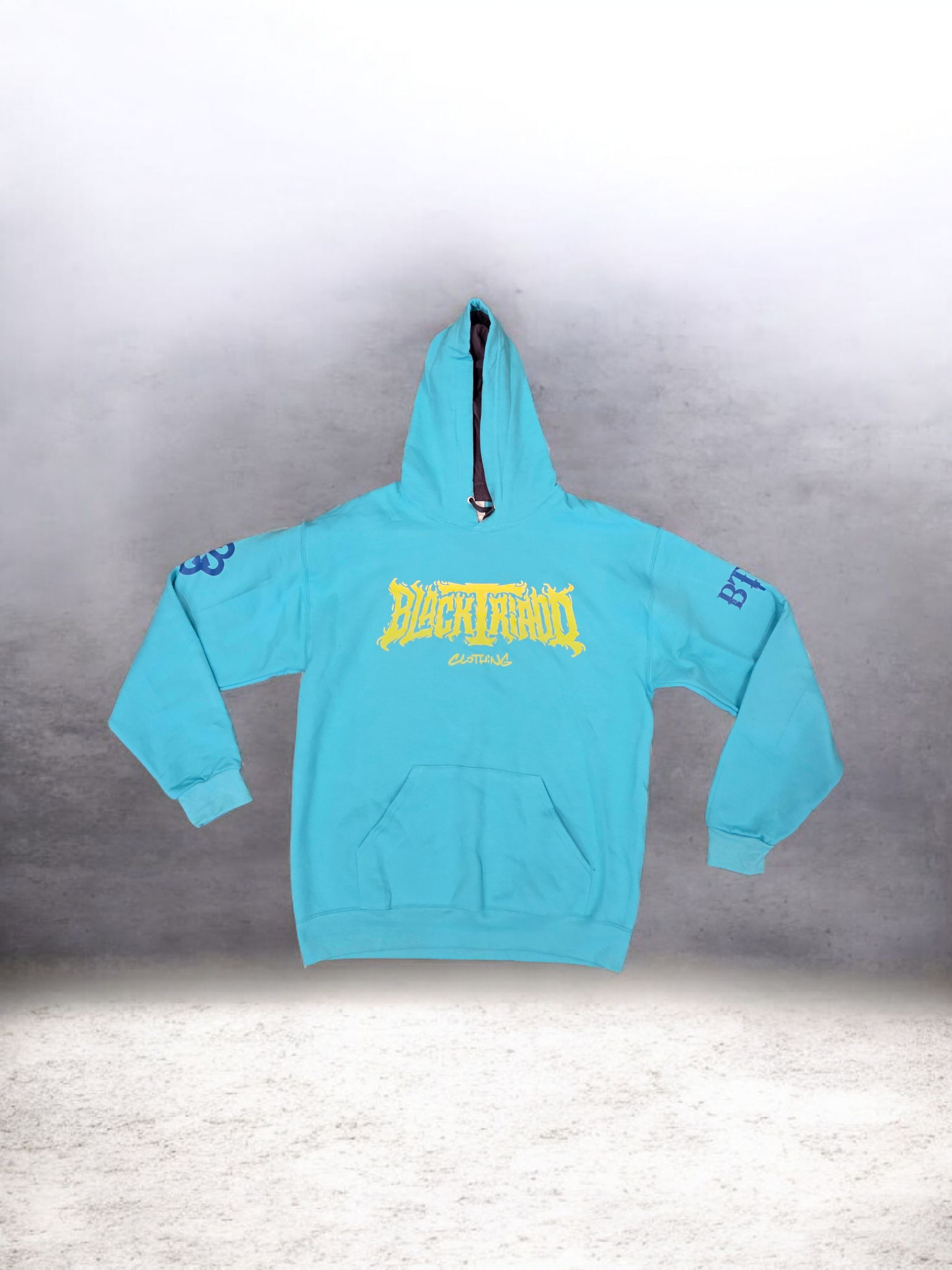 Blue unisex hoodie with a yellow custom BTC logo on the center of hoodie and blue classic BTC logos placed on the left and right side of hoodies.