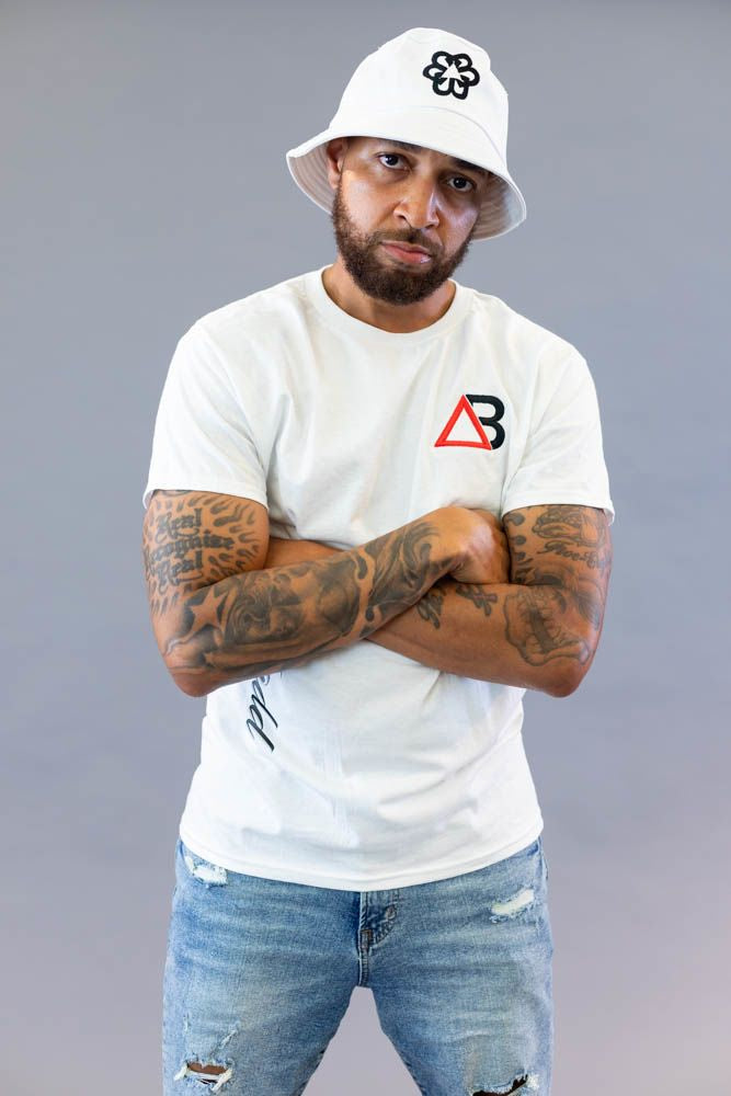 White BTC T-shirt with a black and red "Black Triadd Imprint" Logo placed on the top left side of shirt.