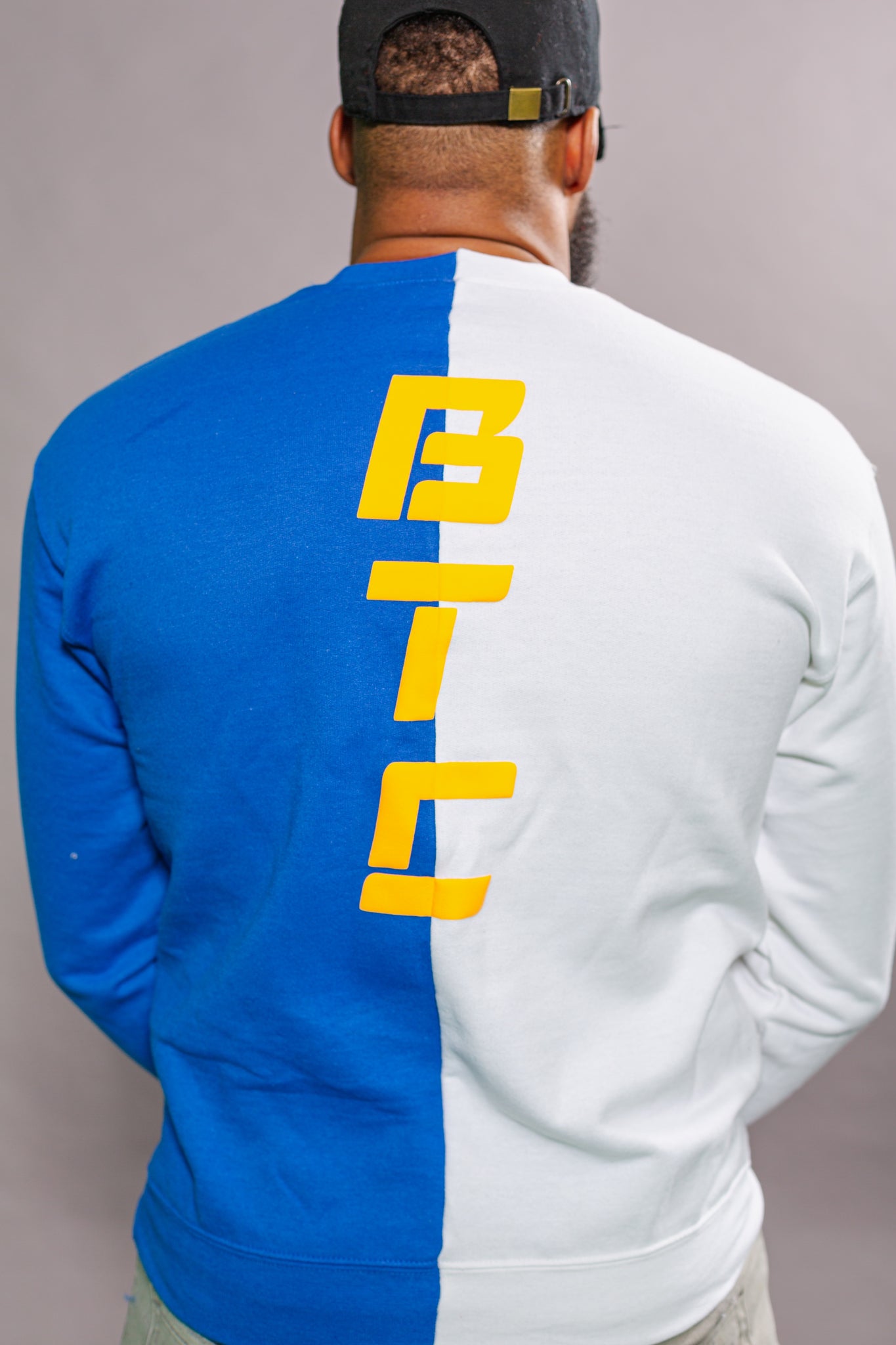 BTC Unisex Blue and White Two-Faced Sweater with an custom orange BTC triple B logo placed on the center of the sweater and a orange BTC custom lettering placed on the center back of sweater.