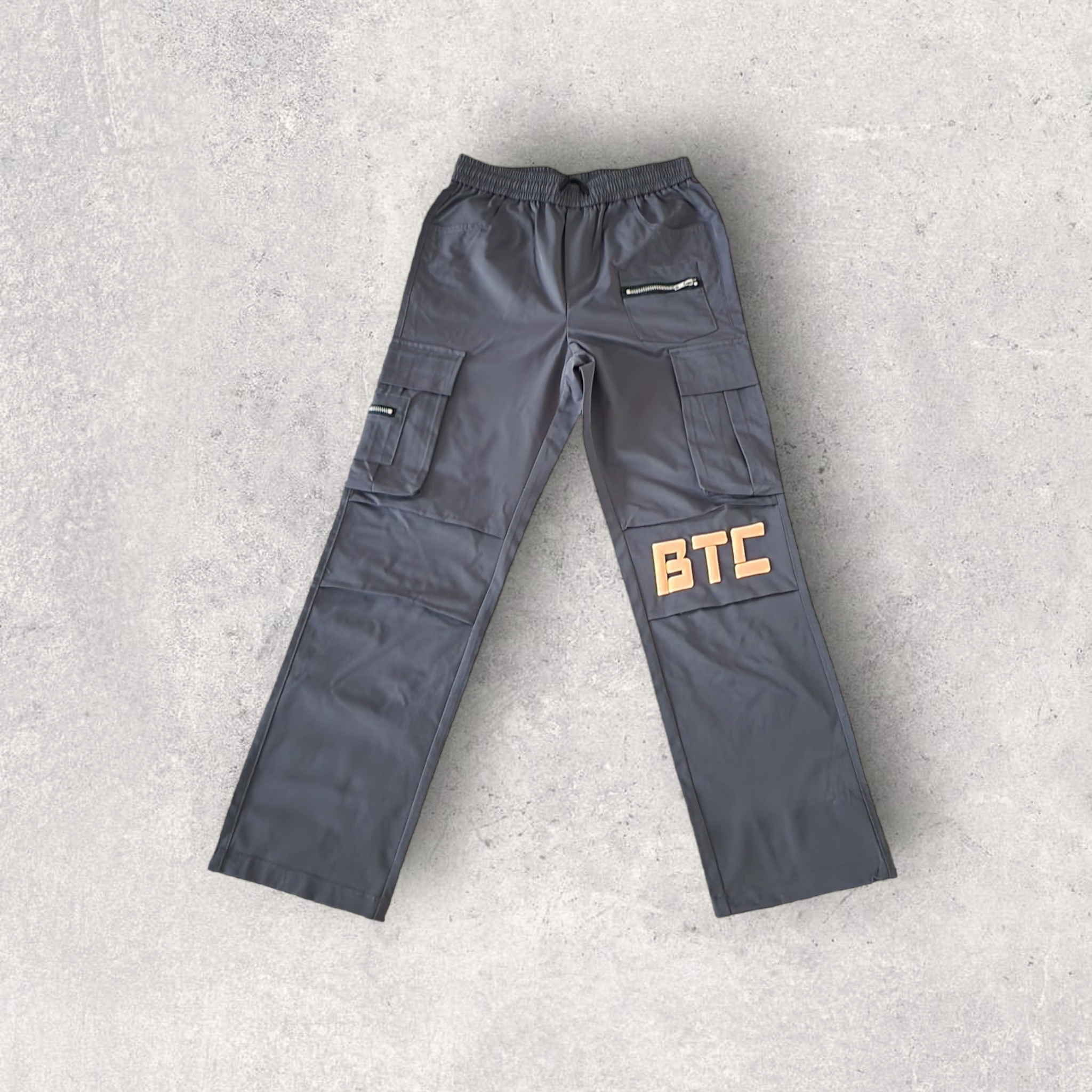 Gray Cargo pants with a orange BTC logo placed on the bottom left pocket of the pants.