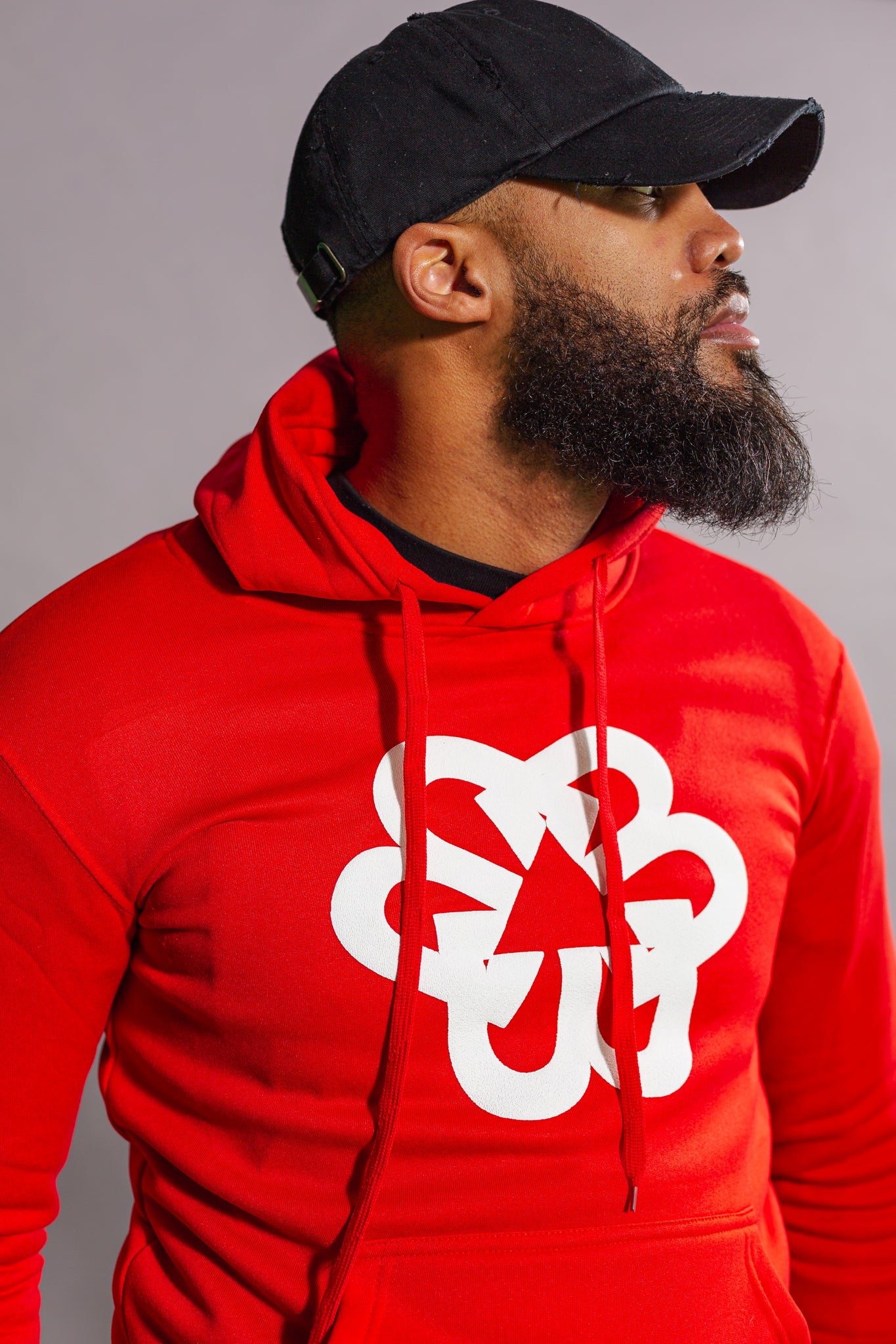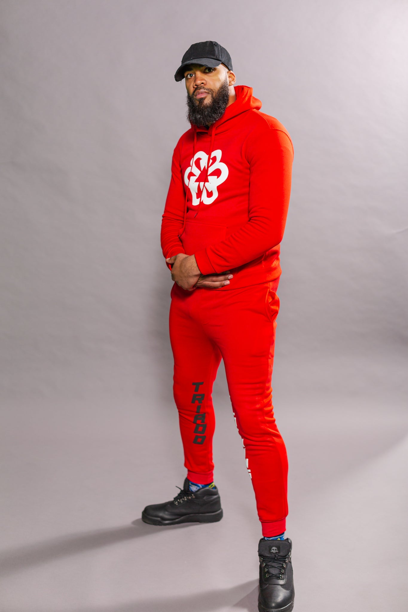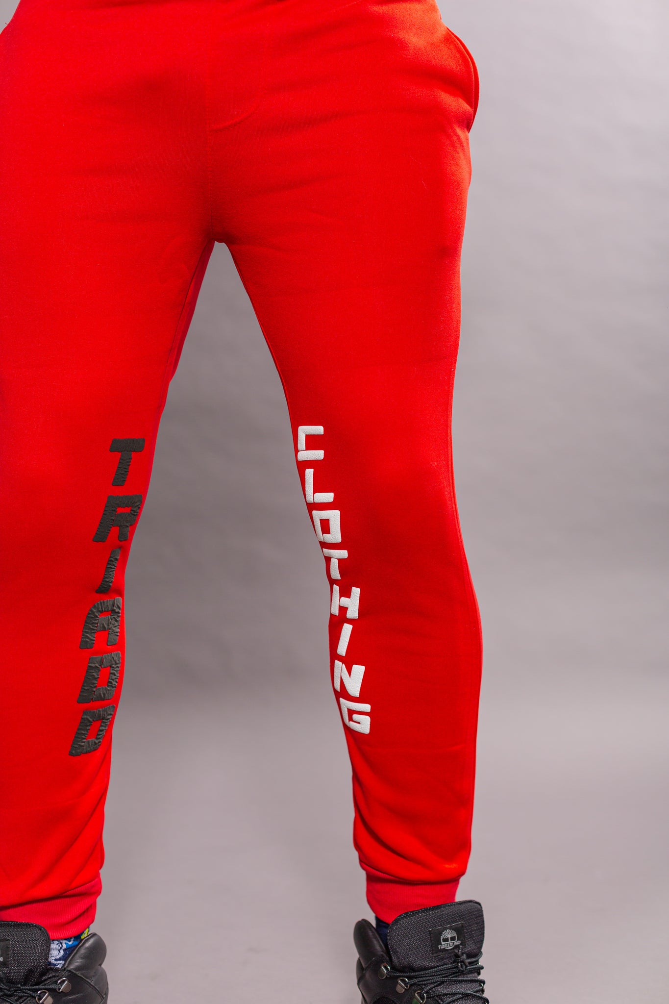 BTC'S Unisex Red Pyramid Splash 💦 Hoodie Set with a white custom BTC triple B logo on the center of the hoodie and black and white "Triadd Clothing" stitching placed in the center of the pants legs.