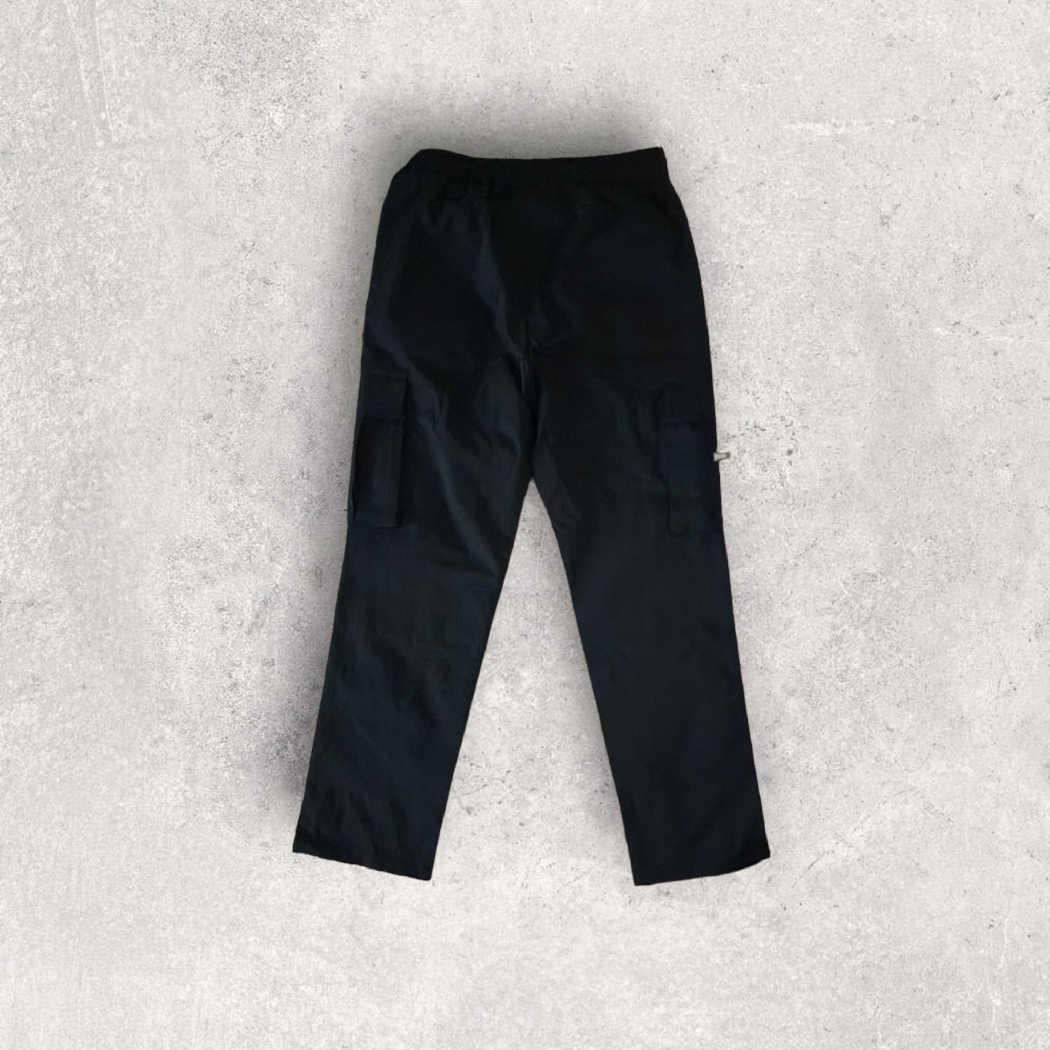 Black Cargo pants with a white BTC logo placed on the bottom left pocket of the pants.