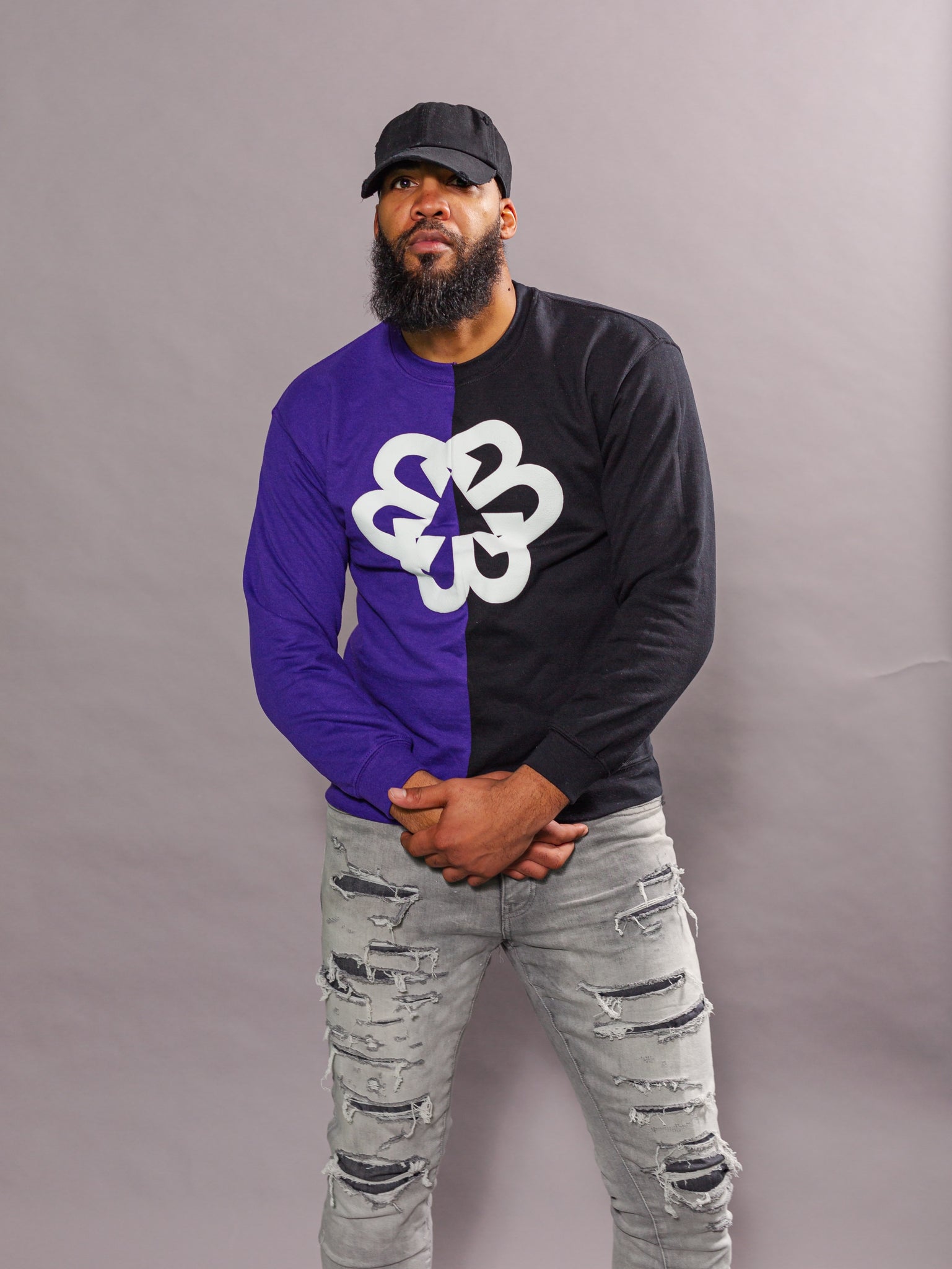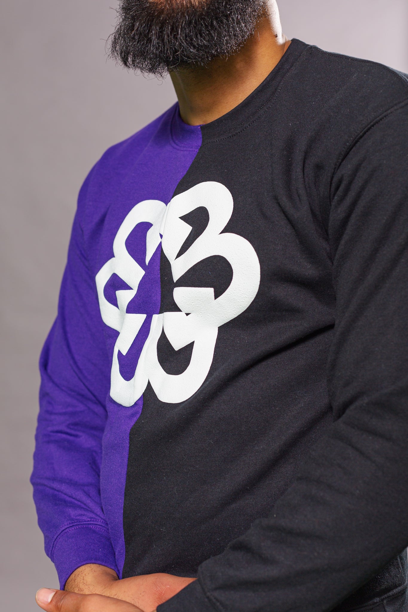 BTC Unisex Purple and Black Two-Faced Sweater with an custom white BTC triple B logo placed on the center of the sweater and a white BTC custom lettering placed on the center back of sweater.