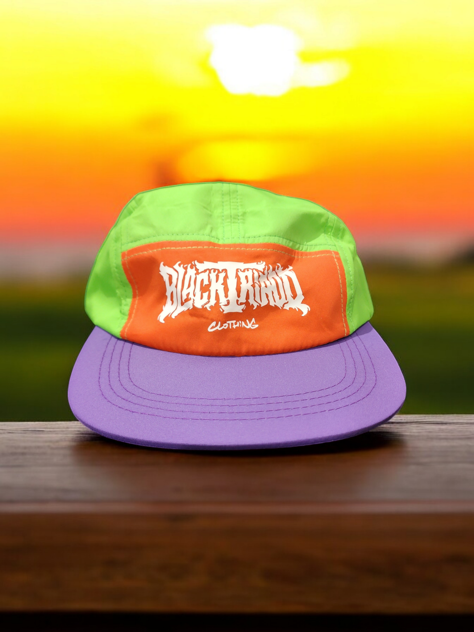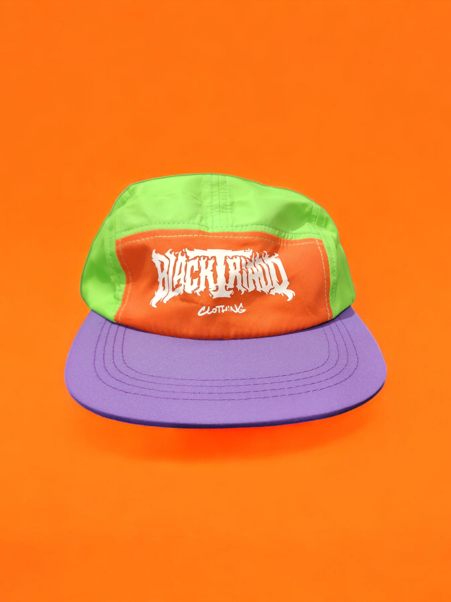 Purple, Orange, and Green Colorblock Hat with a custom white hand designed Black Triadd Clothing placed in the center of the hat.